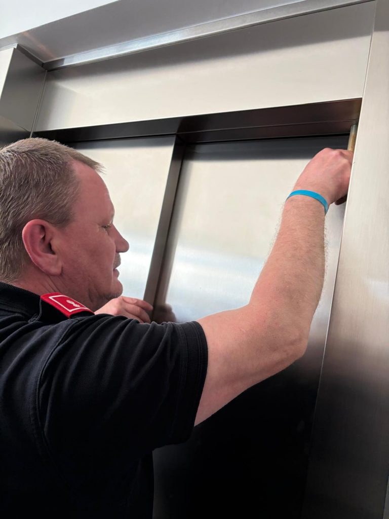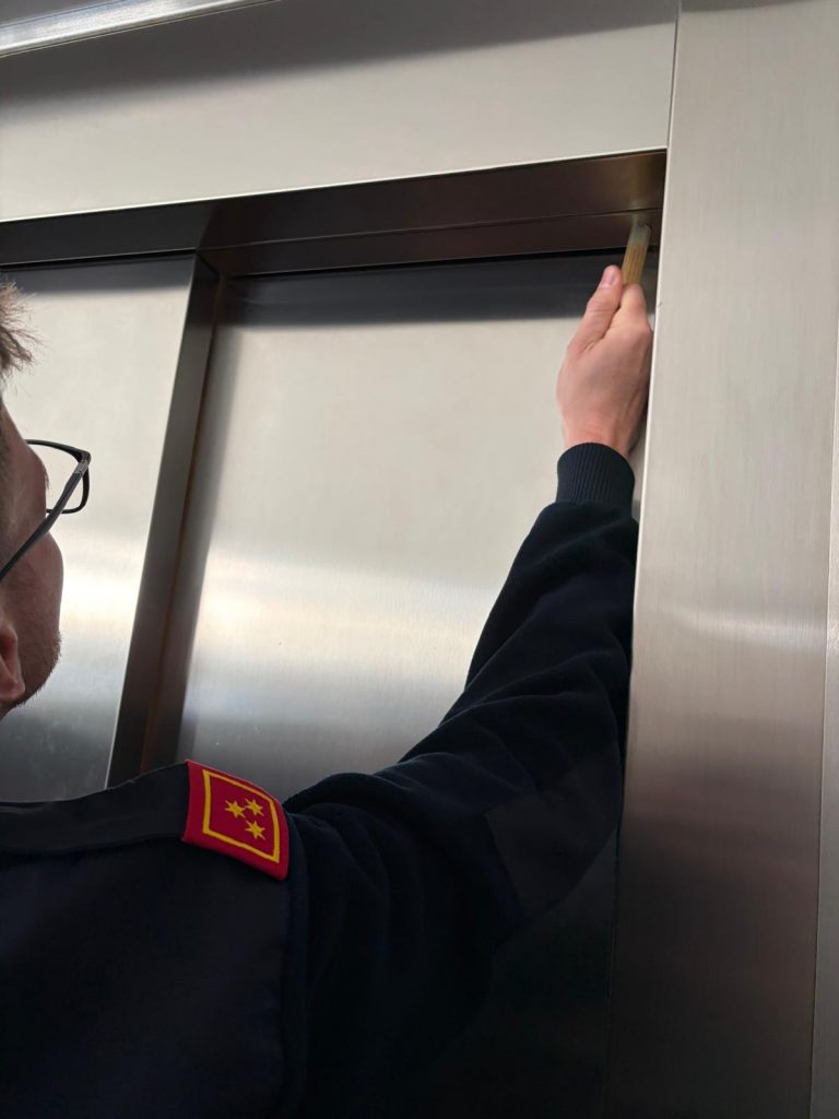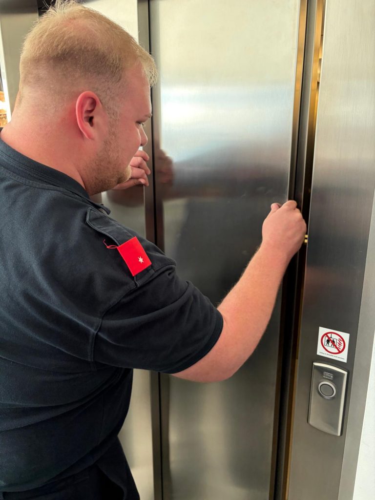 Nach der Unterweisung durften wir die Handhabung des Aufzugs auch selbst, so wie es in verschiedenen Situationen vorkommen kann, ausprobieren.